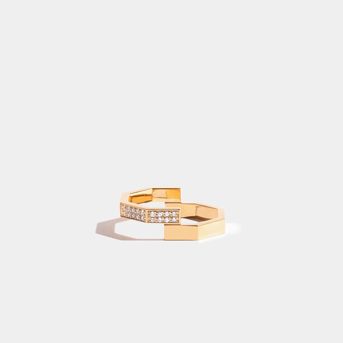 Inspirée de la forme éponyme, Octogone réinterprète un classique de l’architecture formelle. Des bijoux-objets qui s’éloignent de leur forme originelle pour en créer une autre. Dissociée, facettée, duale. Une dualité cadencée dans un bijou à la beauté pure, donnant naissance, au sein d’une forme reconnue, à une intimité particulière.