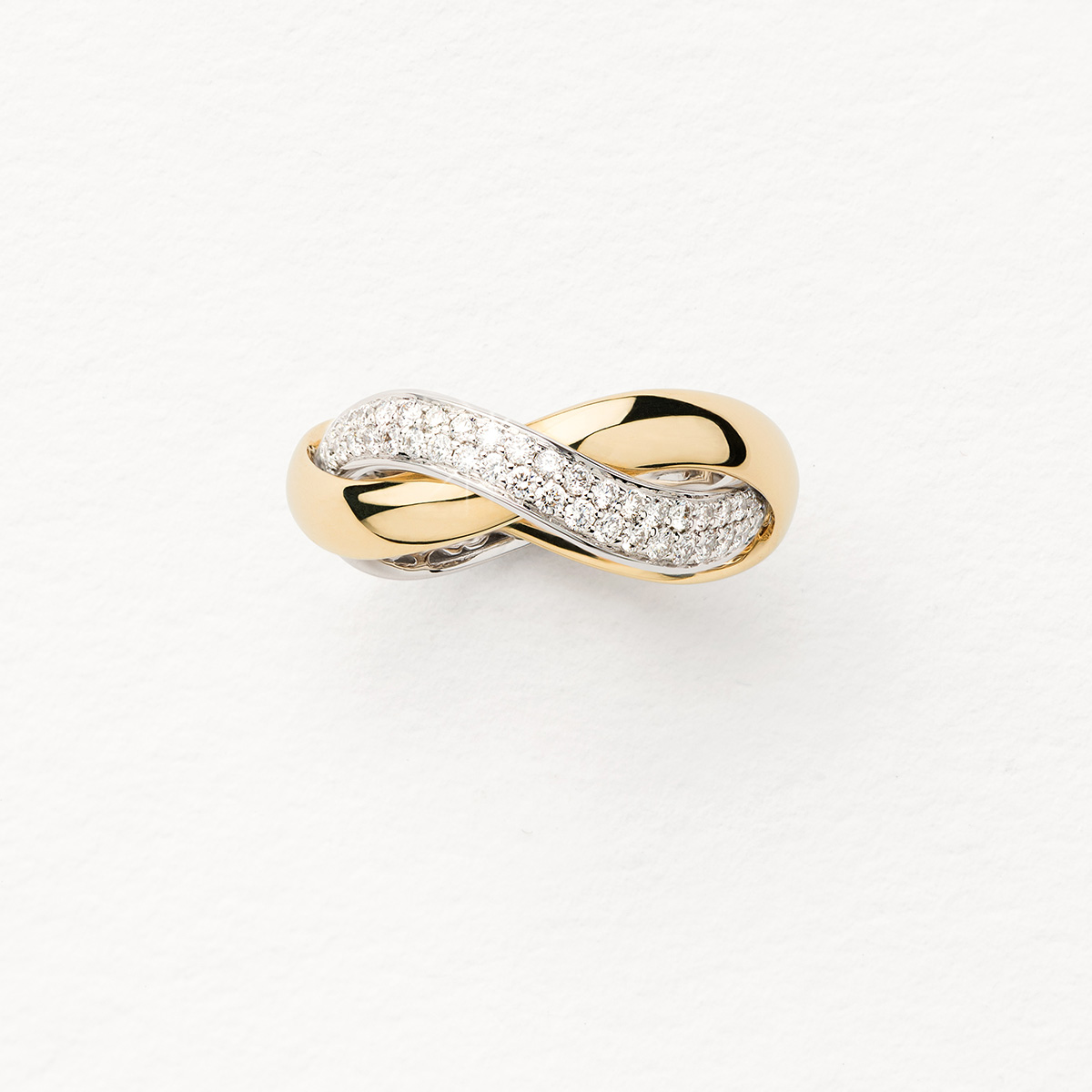 Bague Tresse moyen modèle en or jaune et or blanc pavée de diamants.
