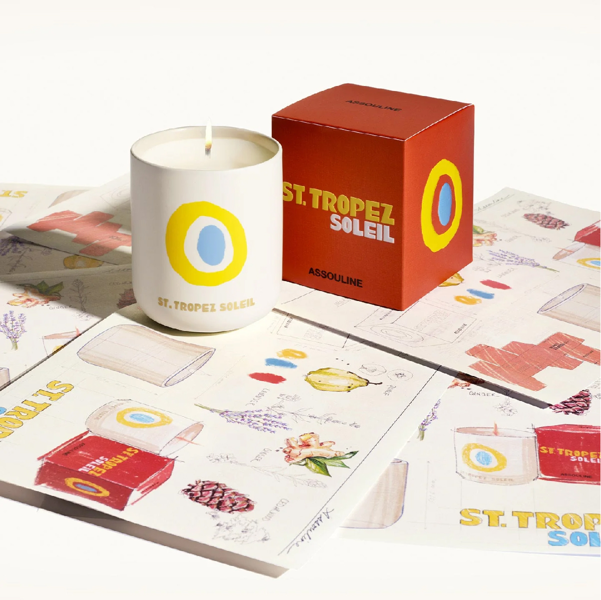 Bougie parfumée dans un récipient en céramique. Sérigraphie emblématique du symbole que l’on voit sur le livre coordonné St Tropez. Fragrances principales : Coings frais, bois de cèdre riche.