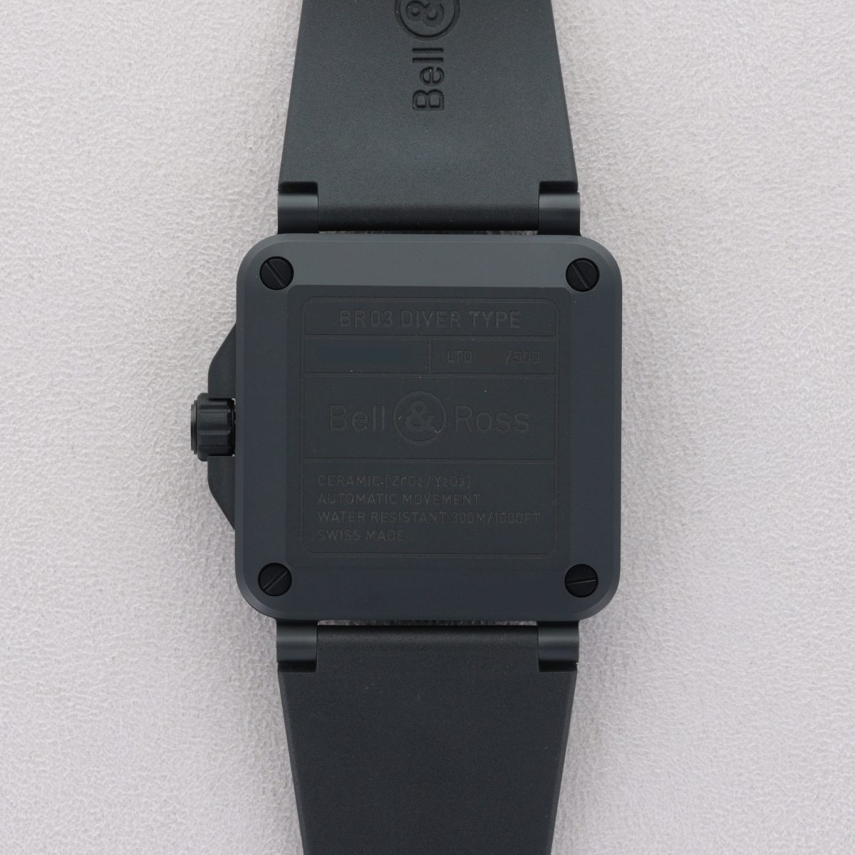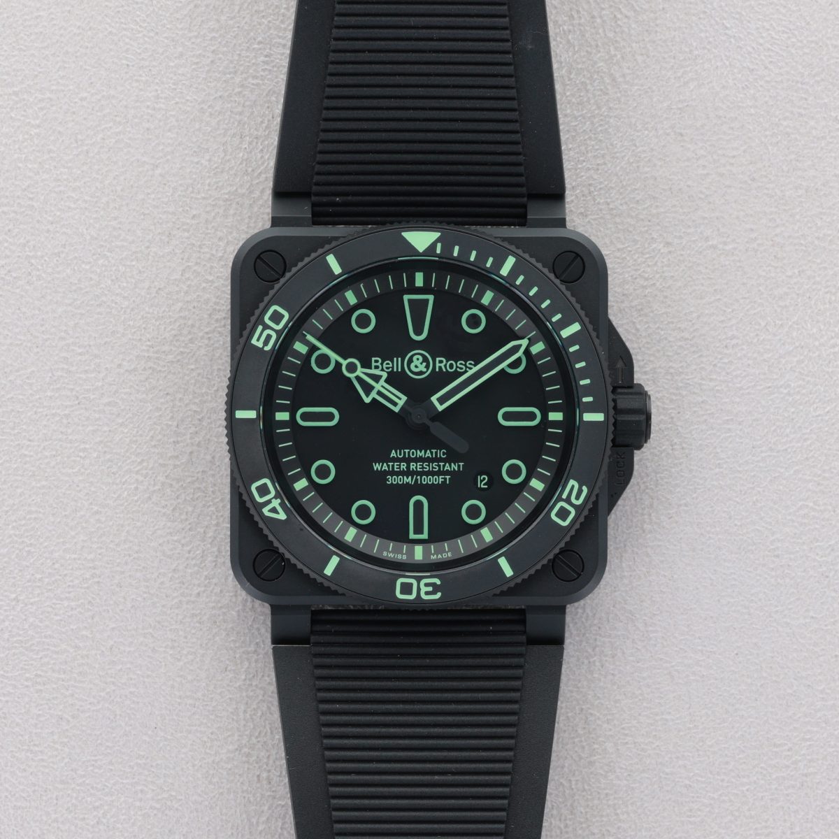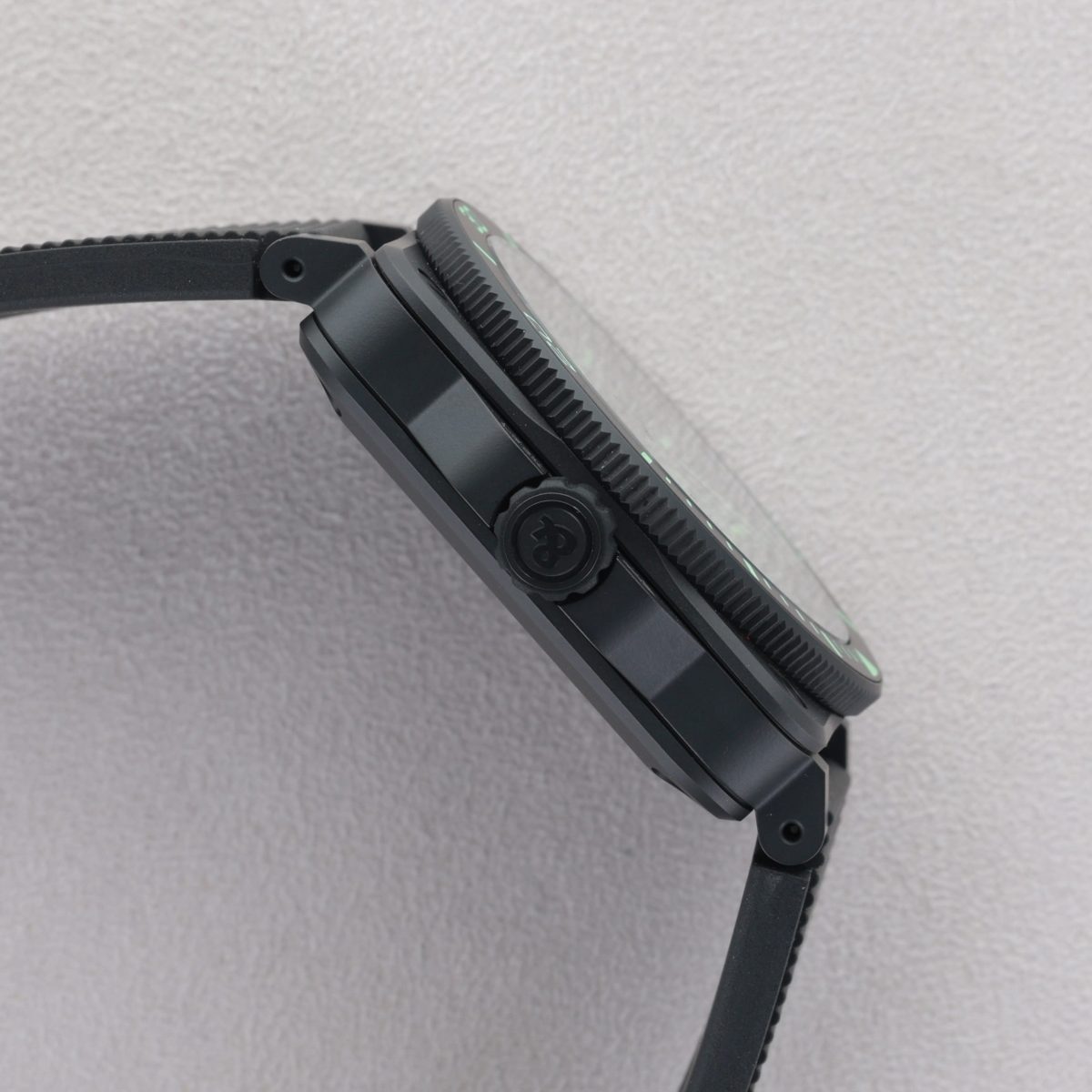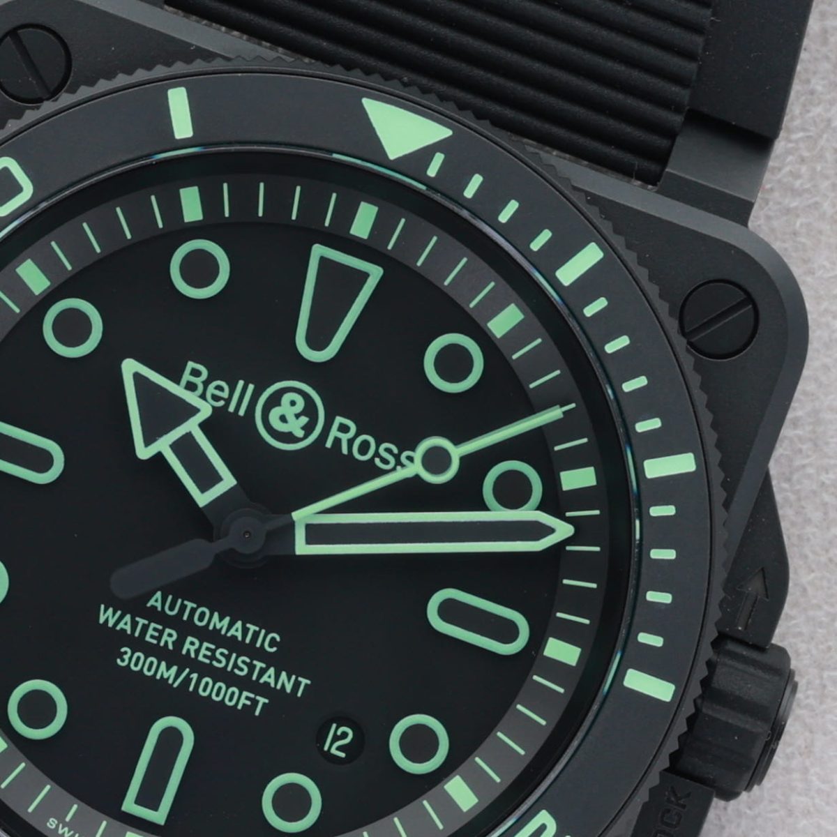 La Bell & Ross BR 03 Diver Military se distingue par son allure furtive et technique, inspirée directement du monde de l’aviation et des unités d’élite. Son boîtier de 42 mm est conçu en céramique noire mate, un matériau léger et pratiquement inrayable, offrant une résistance extrême en mission.