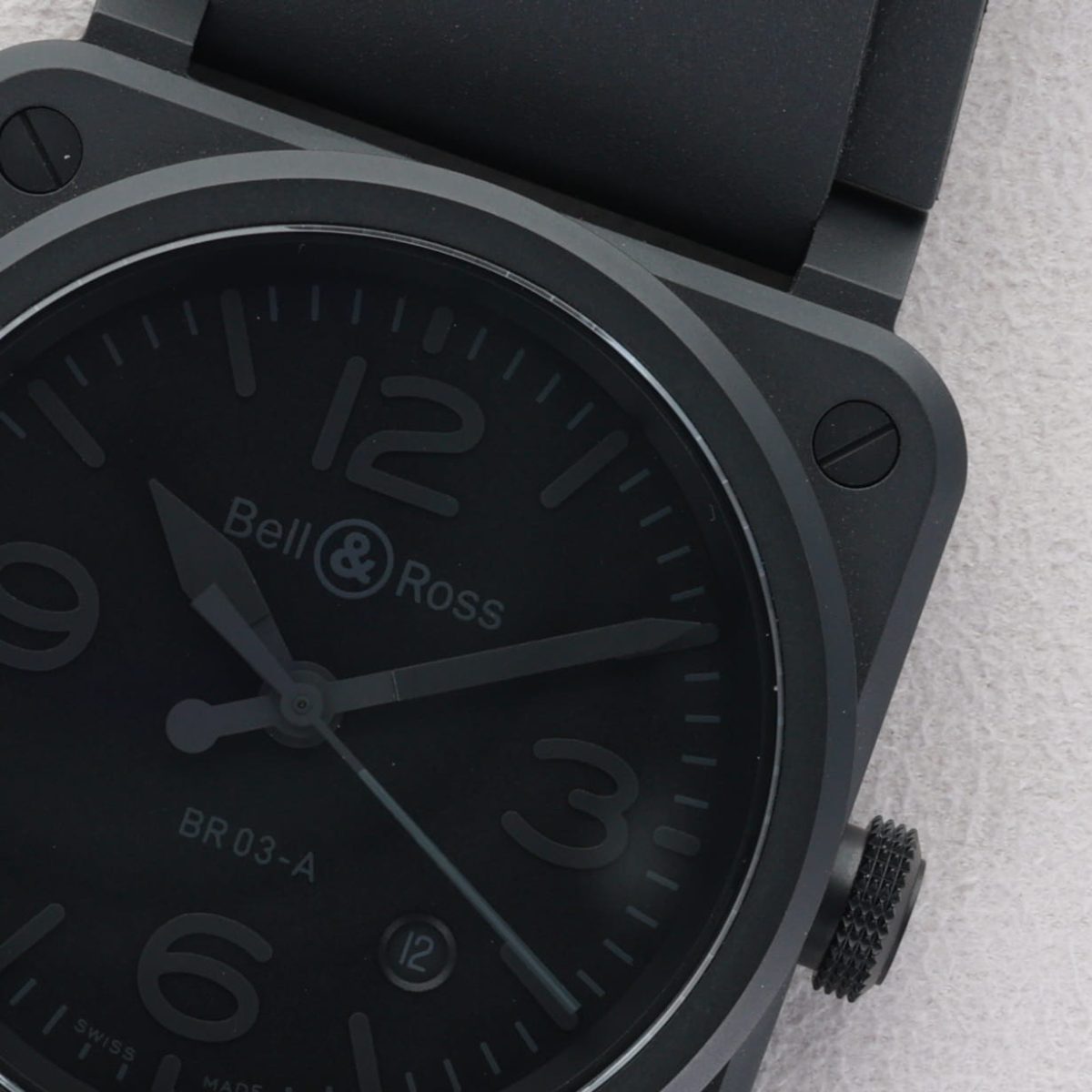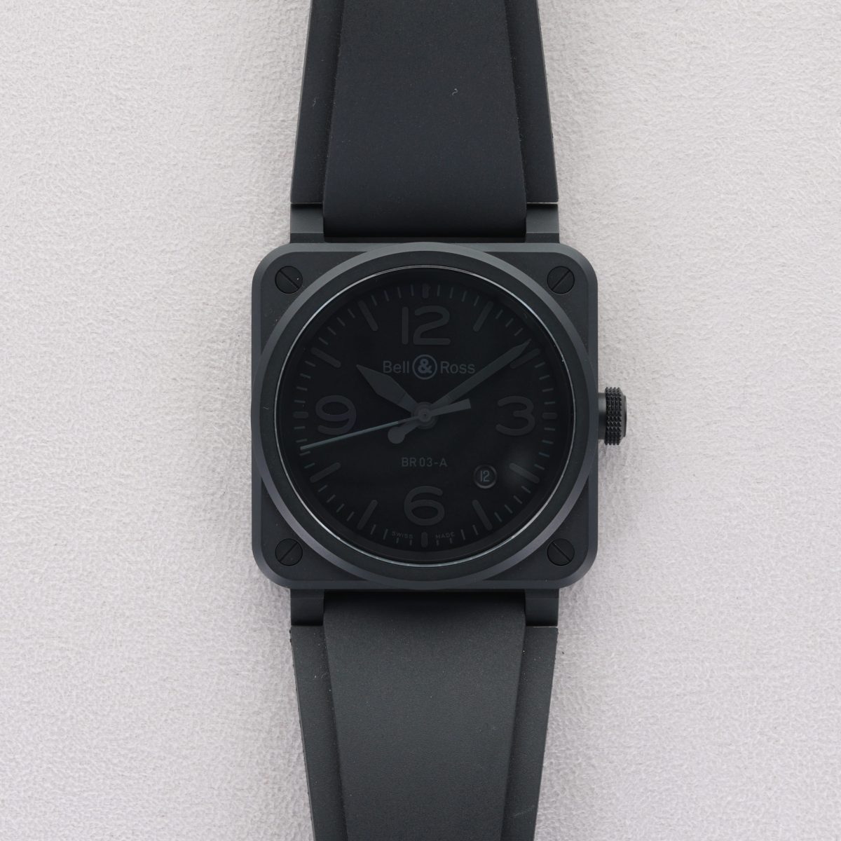 La Bell & Ross BR 03 Phantom (réf. BR03A-PH-CE/SRB) se distingue par son boîtier carré de 41 mm en céramique noire microbillé, offrant une allure à la fois moderne et robuste. Son cadran noir mat, agrémenté d’index et de chiffres arabes luminescents, assure une lisibilité optimale dans toutes les conditions. Animée par le mouvement automatique suisse BR-CAL.302, elle offre une réserve de marche de 54 heures. La montre est équipée d’un bracelet en caoutchouc noir, complété par une boucle ardillon noire, et est livrée avec une sangle supplémentaire en tissu synthétique noir. Résistante à l’eau jusqu’à 100 mètres, elle allie performance et design épuré.