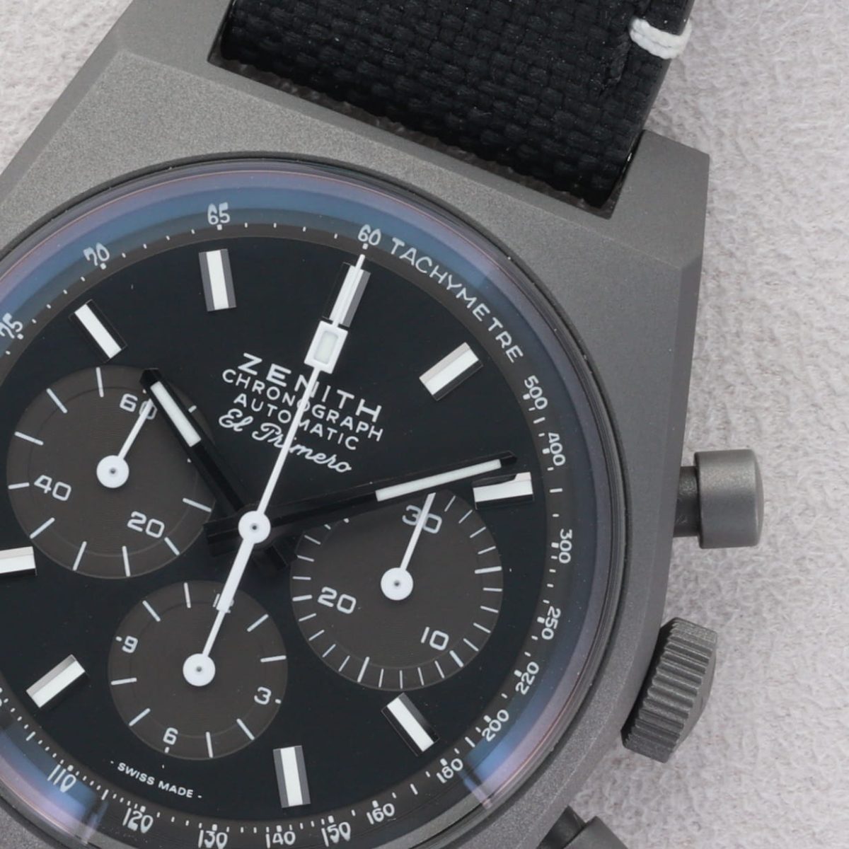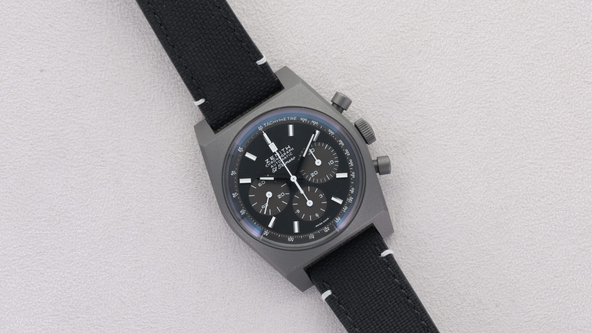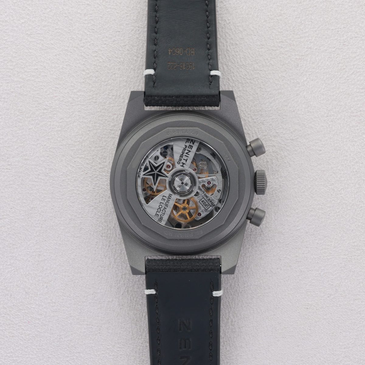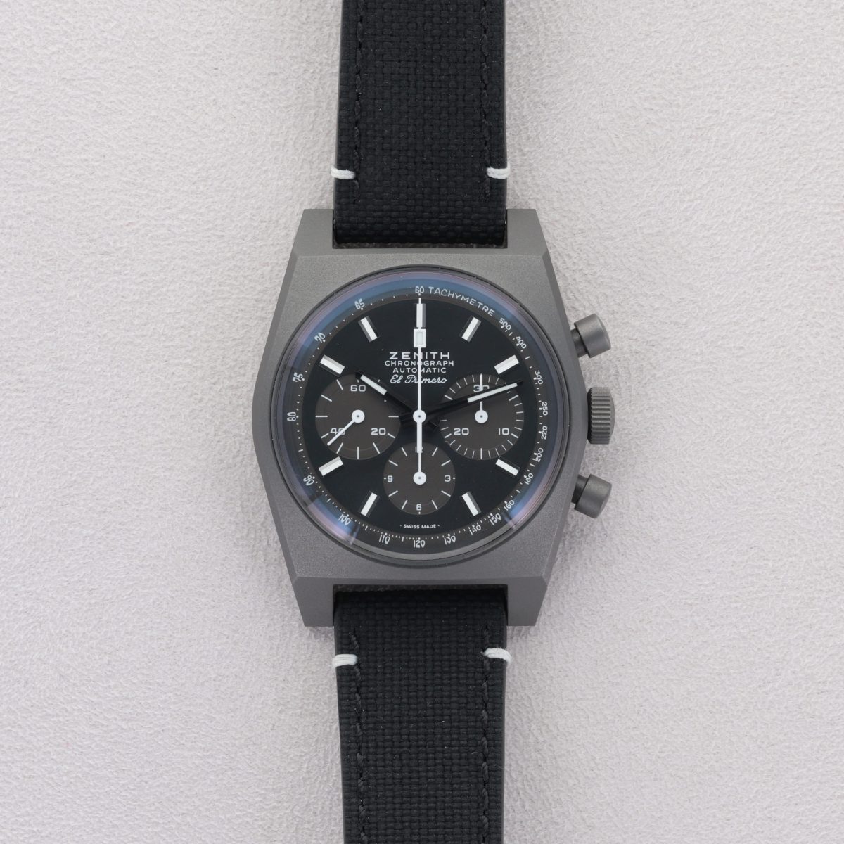 La Zenith Chronomaster Revival Shadow (réf. 97.T384.4061/21.C822) est une pièce furtive et audacieuse qui s’inspire d’un prototype de chronographe noir de 1970 resté mystérieusement dans les archives de la manufacture pendant des décennies. Contrairement aux modèles Revival classiques qui misent sur la couleur, celle-ci adopte un look totalement monochrome avec un boîtier de 37 mm en titane microbillé, offrant une finition mate gris foncé extrêmement légère et résistante. Elle bat au rythme du légendaire calibre El Primero 4061 à haute fréquence (36,000alt/h), dépourvu ici de guichet de date pour préserver la pureté et la symétrie du cadran noir aux compteurs gris contrastés. Montée sur un bracelet en caoutchouc noir à l’aspect « Cordura », cette montre fusionne parfaitement le charme vintage du boîtier tonneau originel avec une esthétique moderne, sombre et résolument minimaliste.