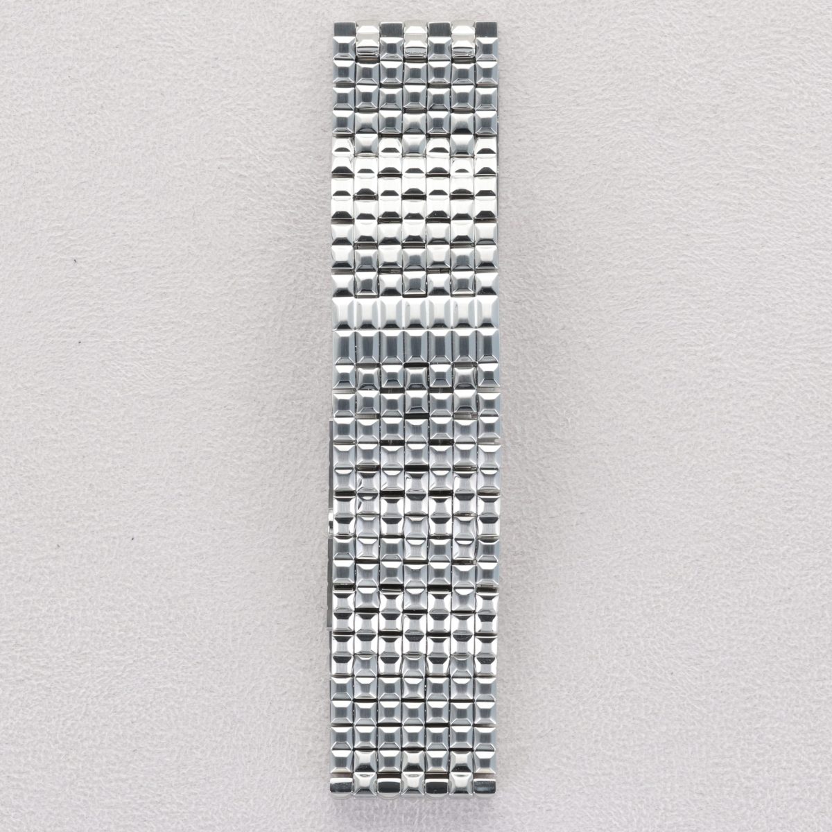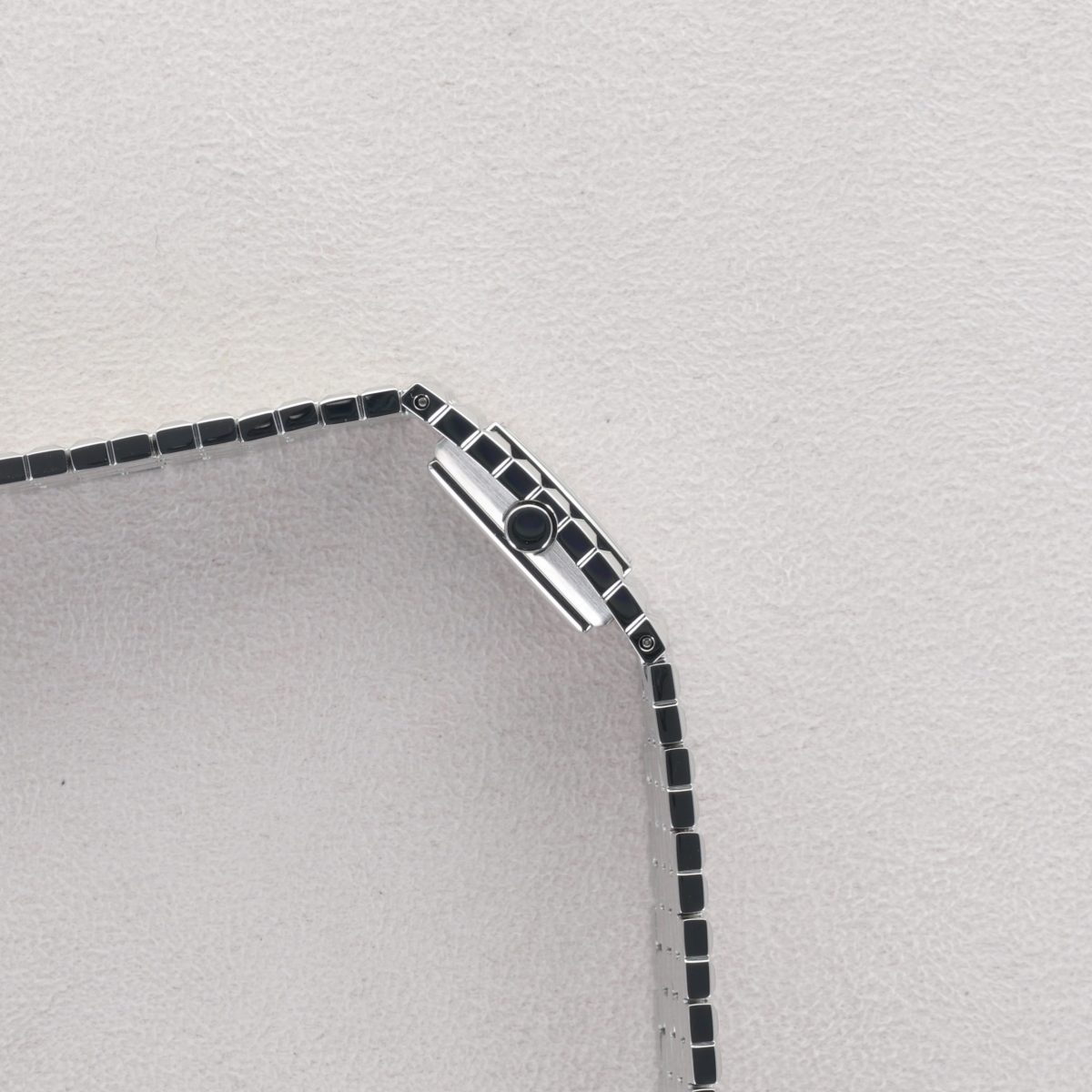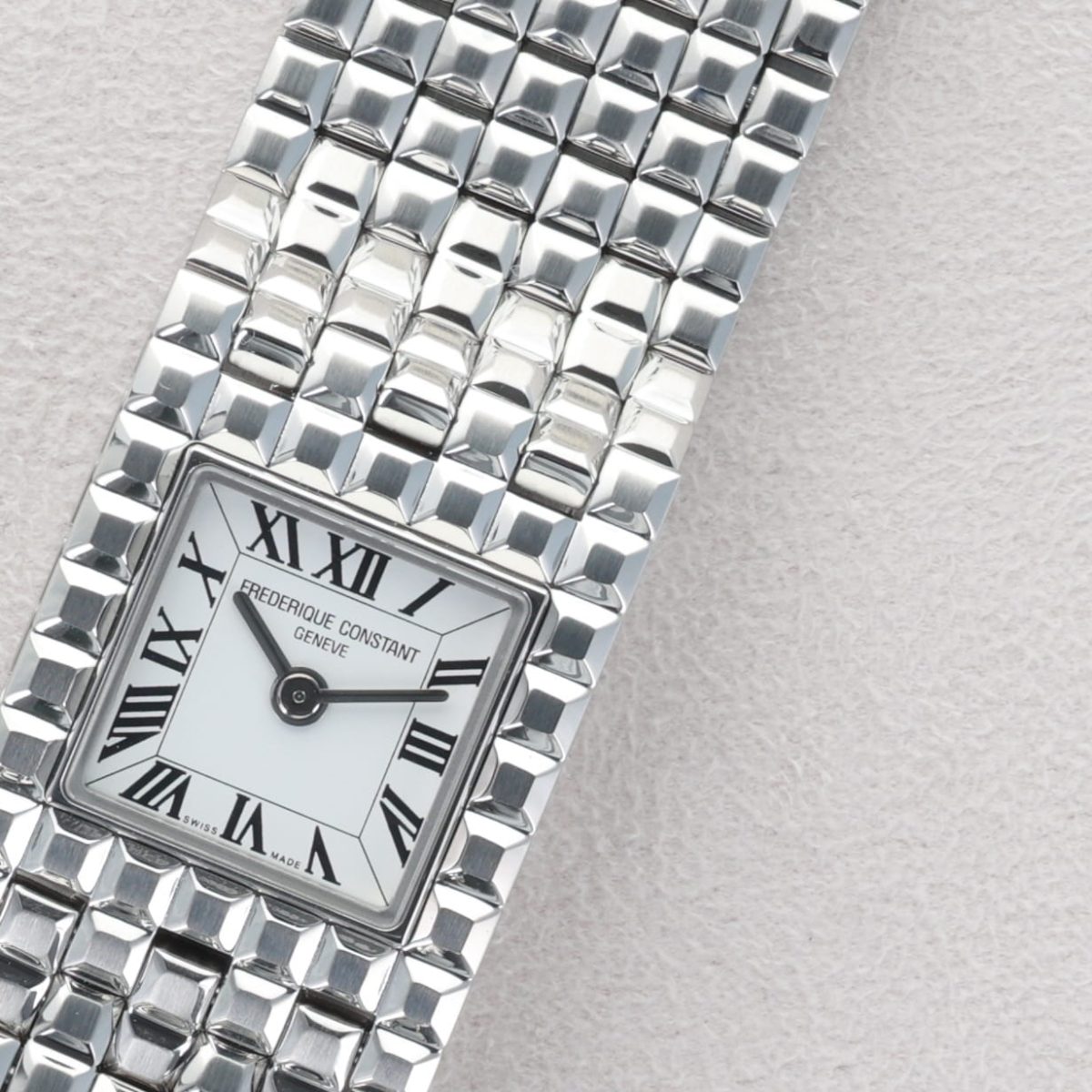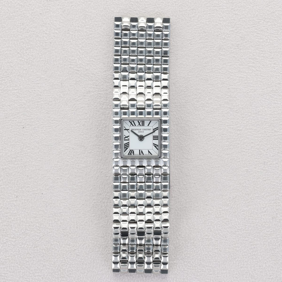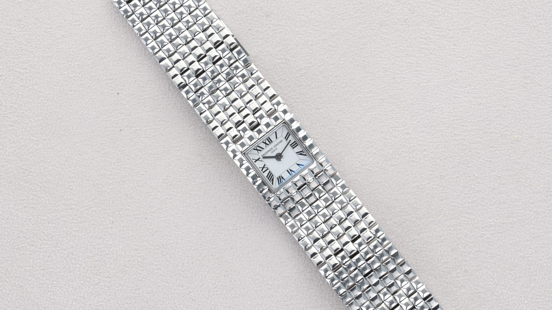 Boîtier en acier inoxydable poli, dimensions du boîtier sans la couronne (L x l x H) : 26 x 20 x 6,9 mm. Lunette en acier inoxydable avec motif pyramidal poli. Bracelet en acier inoxydable avec motif pyramidal poli, fermoir déployant double en acier inoxydable. Cadran blanc avec chiffres romains et aiguilles en acier inoxydable. Mouvement à quartz, calibre Frédérique Constant. Affichage des heures et des minutes par aiguilles centrales. Verre saphir résistant aux rayures. Couronne intégrée au boîtier. Fond en acier inoxydable gravé