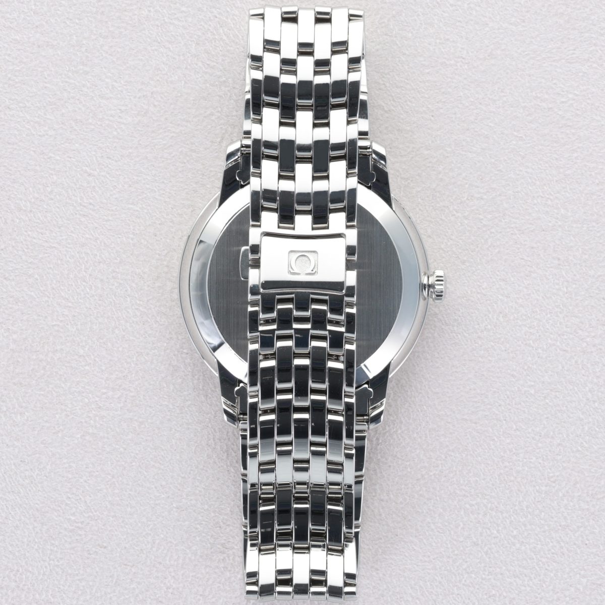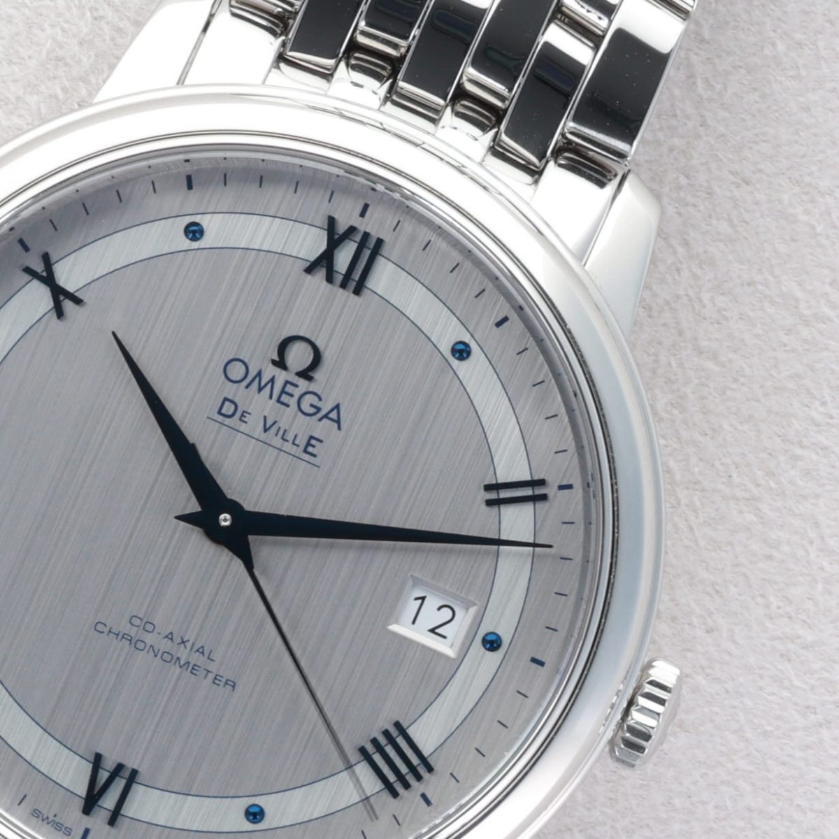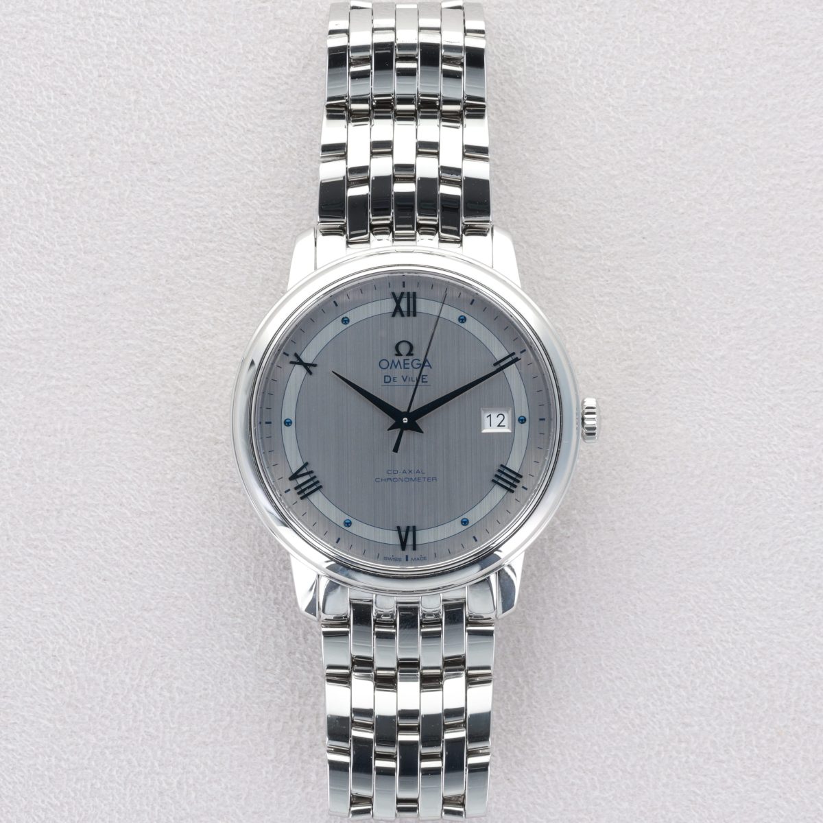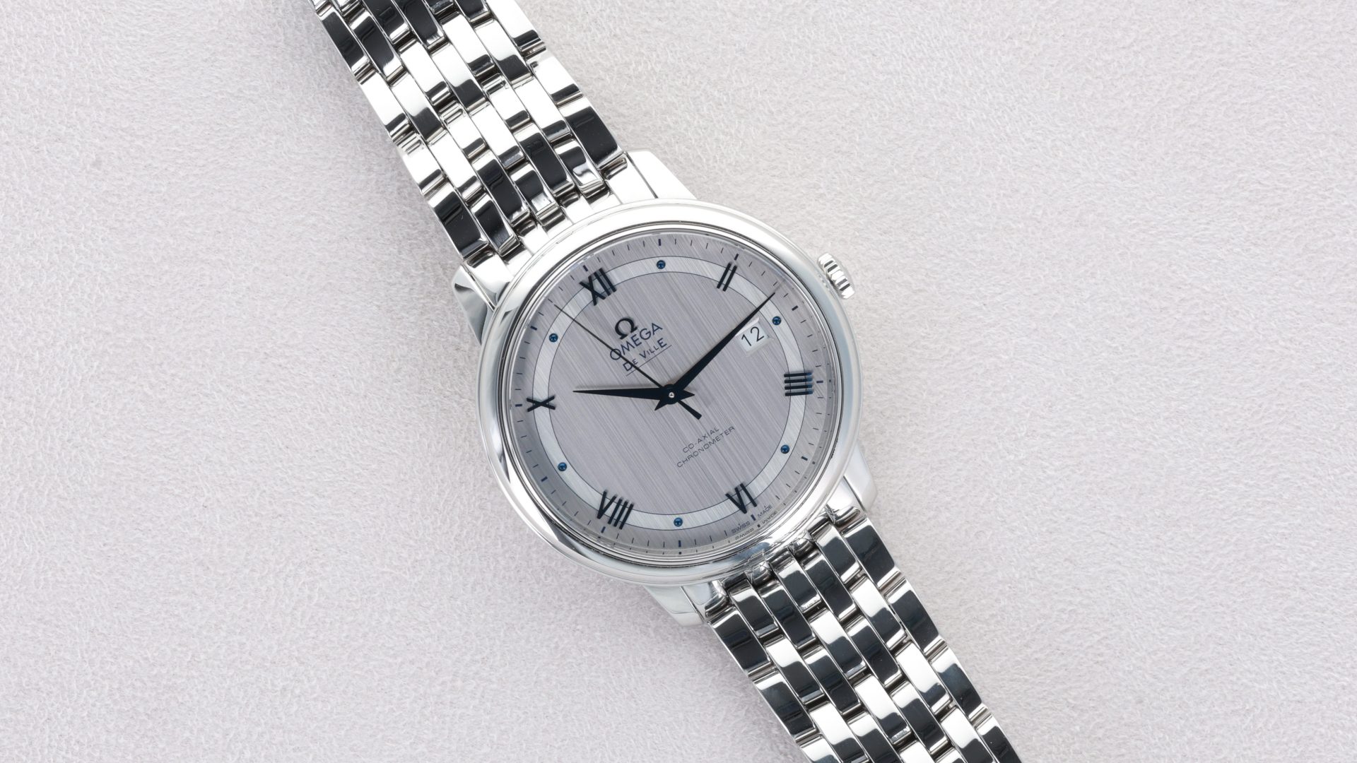 Le boîtier en acier inoxydable de 39,5 mm, associé à un bracelet Prestige poli, confère à cette montre une présence élégante au poignet. Elle est animée par le calibre Co-Axial 2500, garantissant précision et fiabilité.