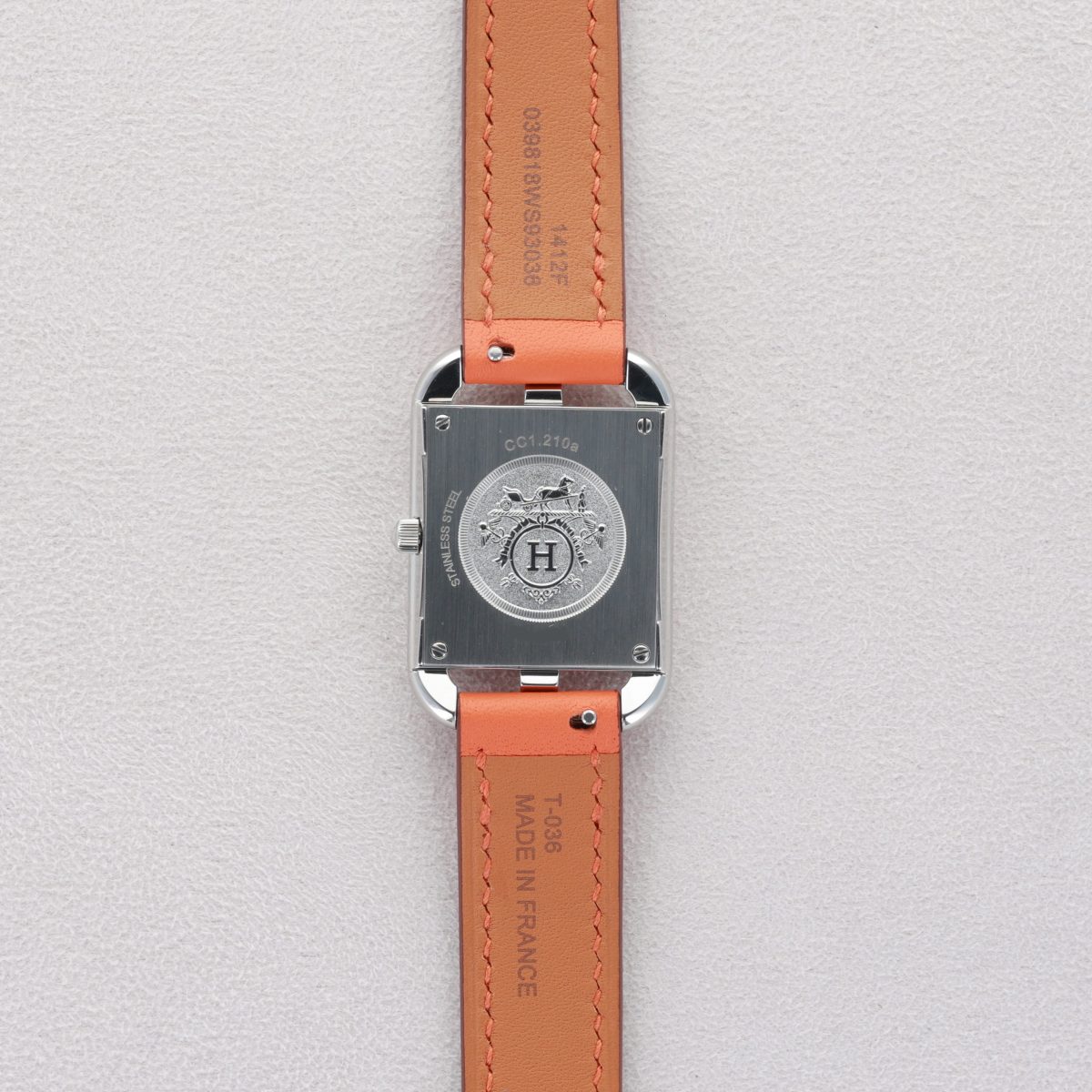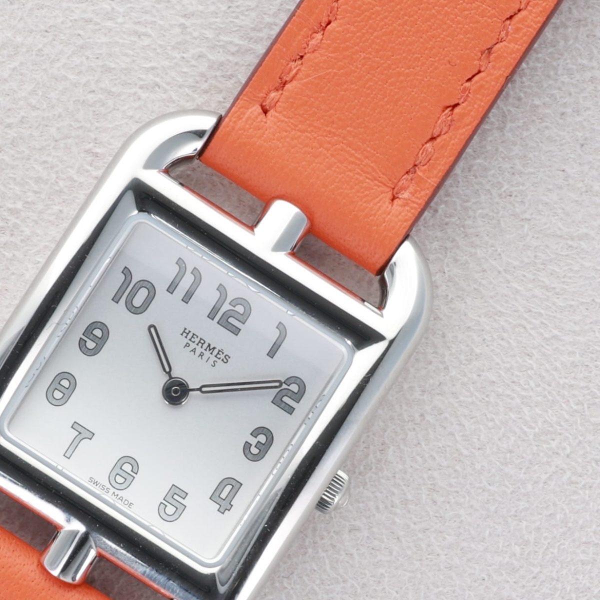 La Hermès Cape Cod séduit par son design iconique inspiré de la célèbre Chaîne d’Ancre de la Maison. Son boîtier rectangulaire en acier souligne un élégant cadran argenté, aux chiffres arabes stylisés emblématiques d’Hermès. Le bracelet en cuir apporte une touche de raffinement et de confort au quotidien. Animée par un mouvement à quartz précis et fiable, elle allie esthétique et praticité. Une montre au style intemporel, parfaite pour accompagner chaque instant avec élégance.