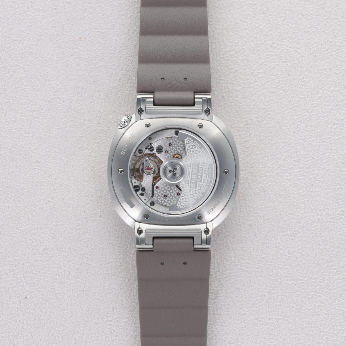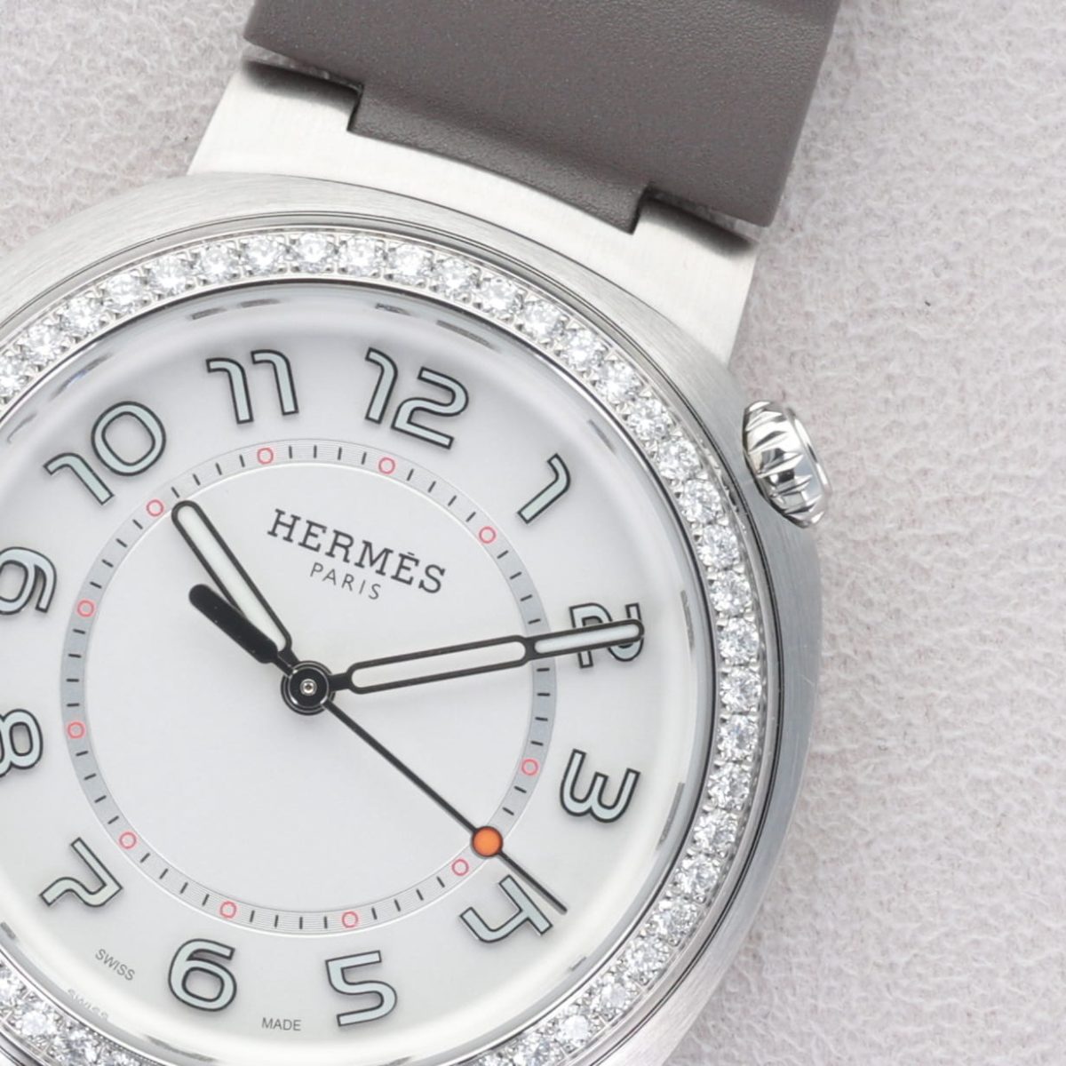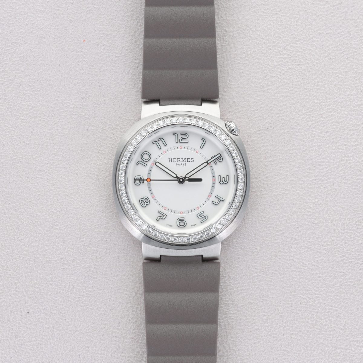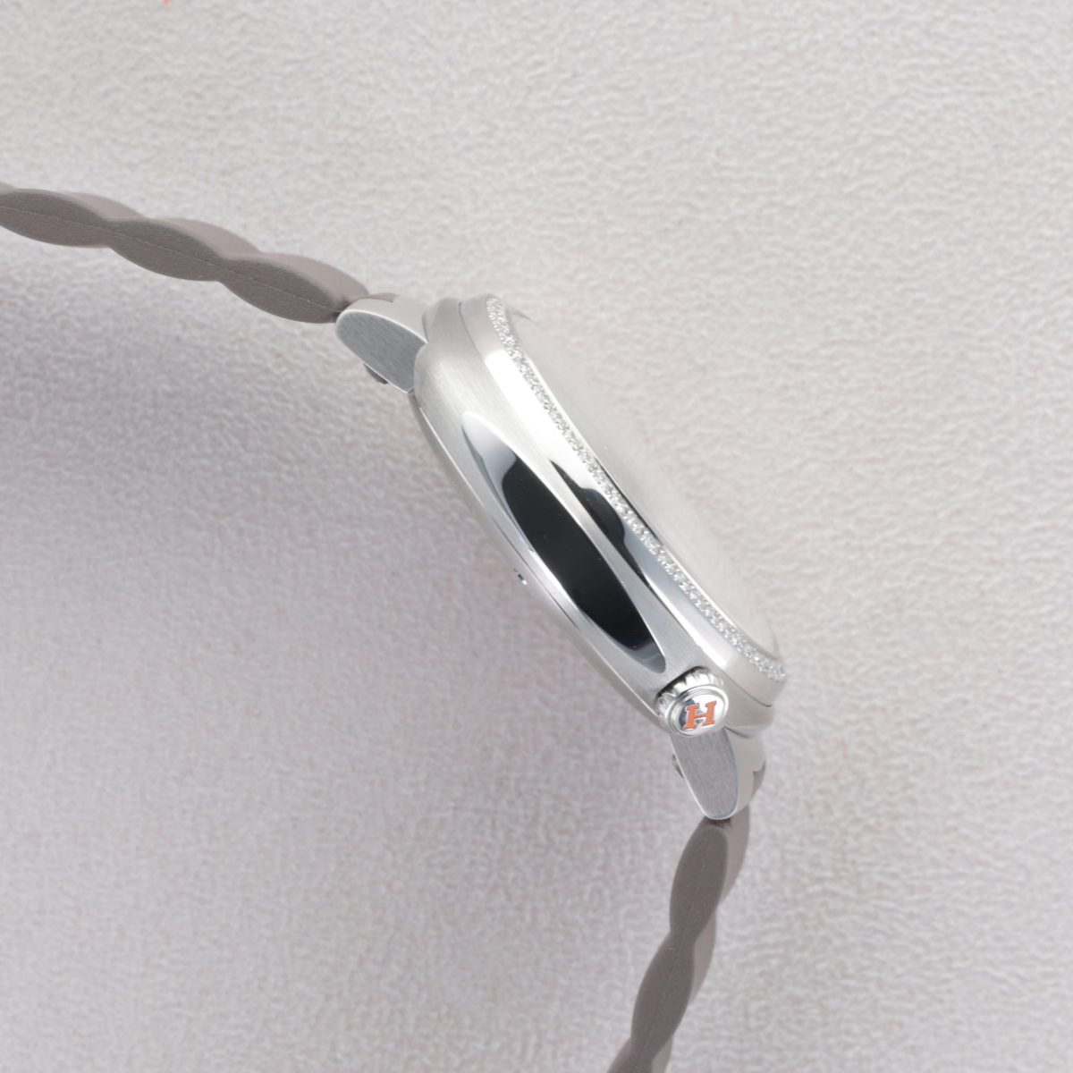 L’Hermès Cut en 36 mm est une pièce d’horlogerie contemporaine qui bouscule les lignes classiques par son boîtier rond aux flancs audacieusement « tranchés », créant un jeu de finitions polies et satinées d’une grande finesse. Caractérisée par sa couronne positionnée de manière inédite à 1h30 et sa typographie exclusive aux chiffres ajourés, elle incarne une élégance sportive et géométrique. Animée par le calibre de manufacture automatique H1912 et dotée d’un système de bracelets interchangeables, cette montre allie la rigueur technique de la haute horlogerie à la polyvalence d’un accessoire de luxe quotidien, capable de passer d’un bracelet en acier sophistiqué à un caoutchouc coloré en un clin d’œil.