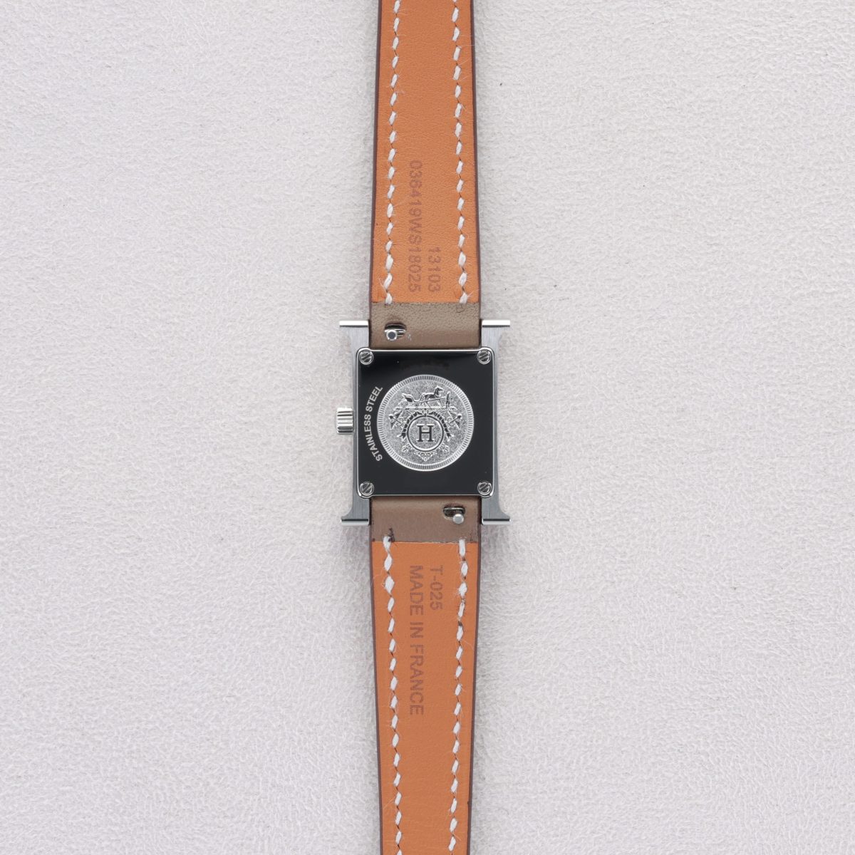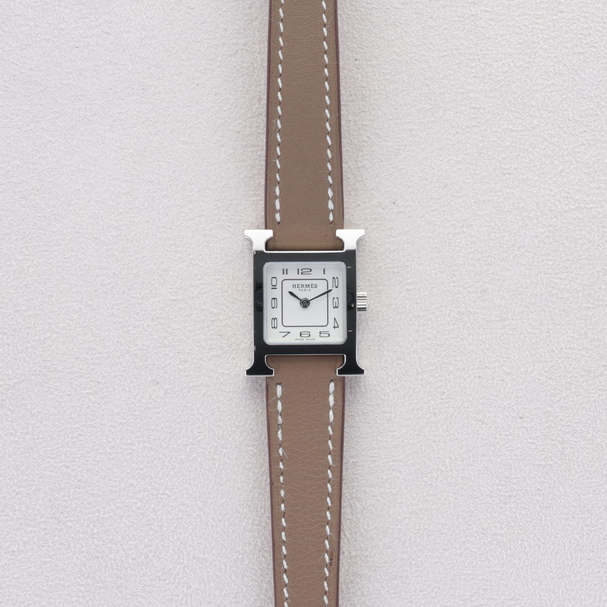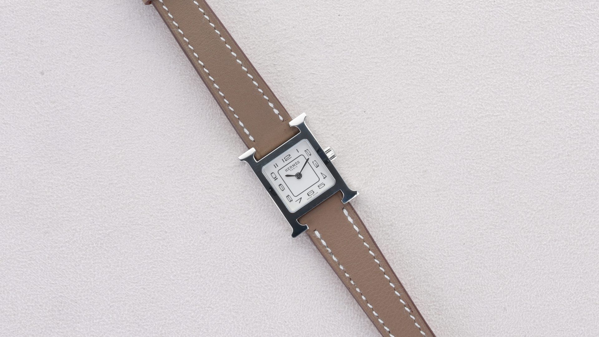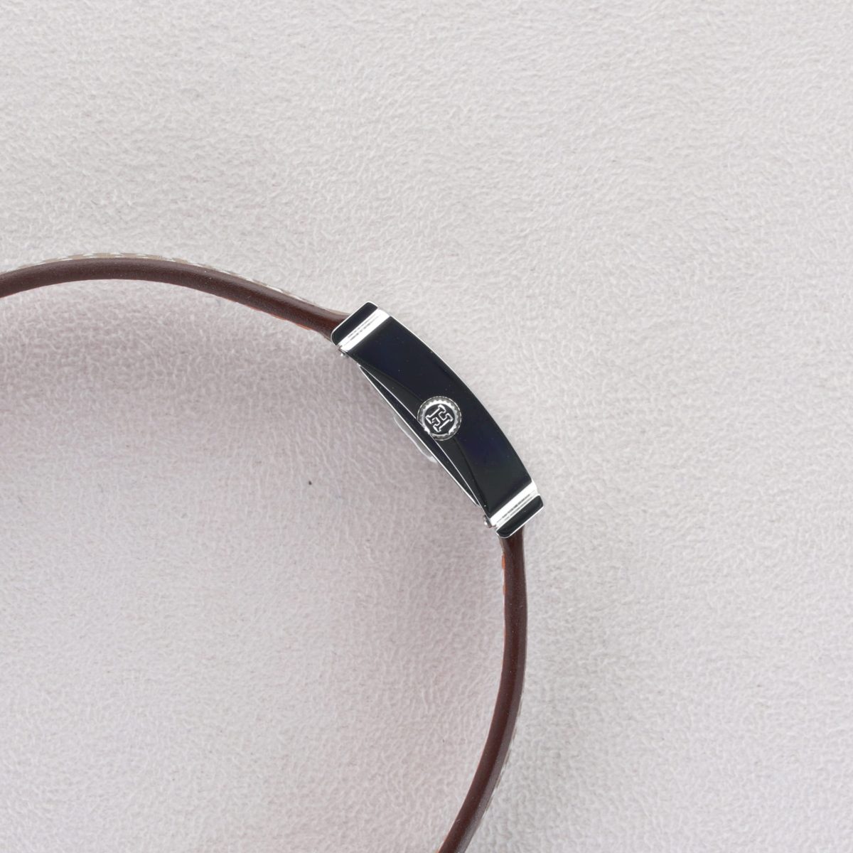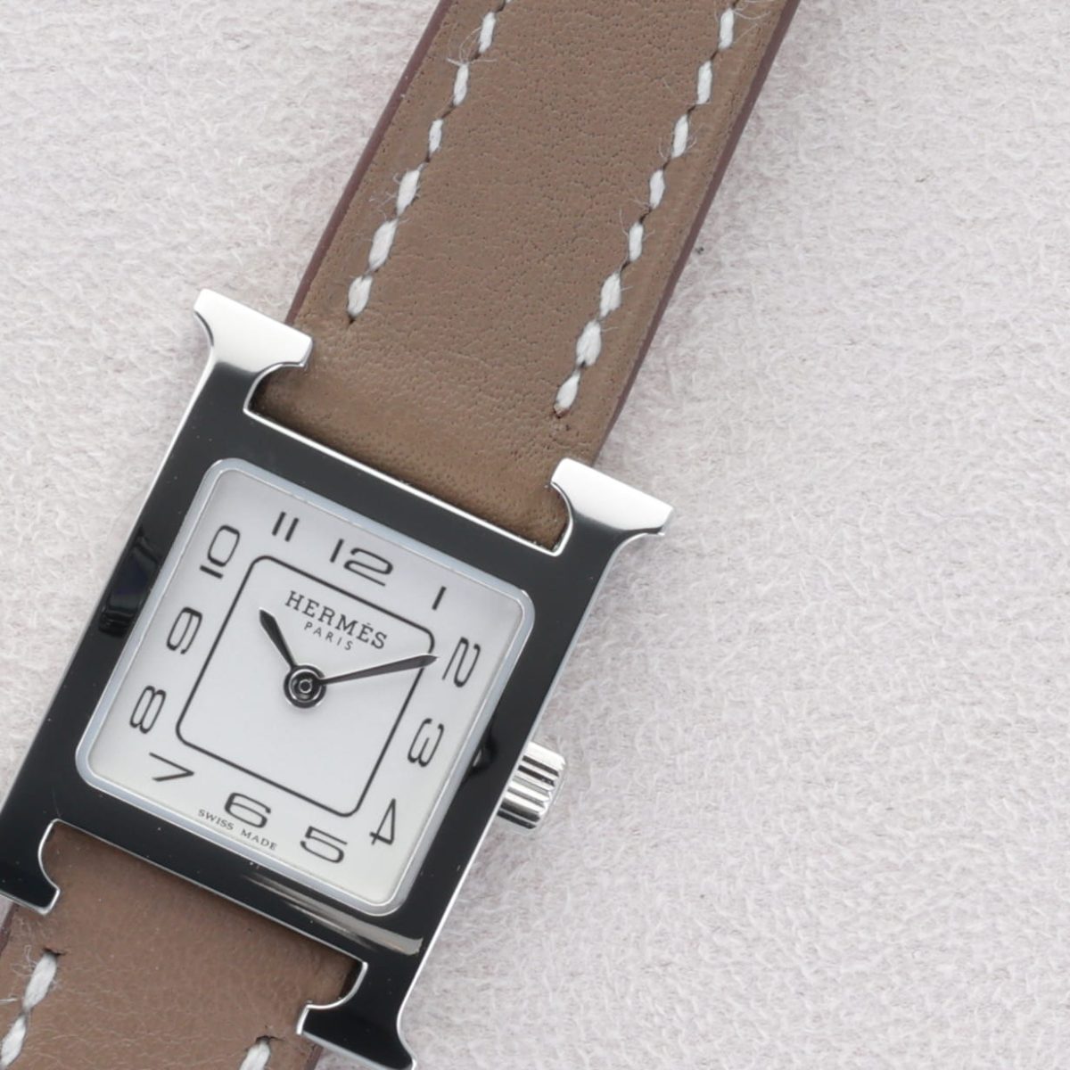 La montre Hermès Heure H Mini se distingue par son boîtier acier de 21 mm complété d’un cadran opalin argenté aux finitions sobres et raffinées. Le bracelet en cuir Swift couleur étoupe, long single-tour, apporte une touche de naturel et de confort, fermé par une boucle ardillon en acier poli. Son mouvement à quartz suisse assure une précision sans complications superflues, avec uniquement heures et minutes. Protégée par un verre saphir antireflet et résistante à une pression de 3 ATM, elle convient à un usage quotidien discret. Cette montre incarne l’élégance minimale chère à Hermès : un design graphique, une sobriété raffinée et un confort d’usage alliant style et simplicité.