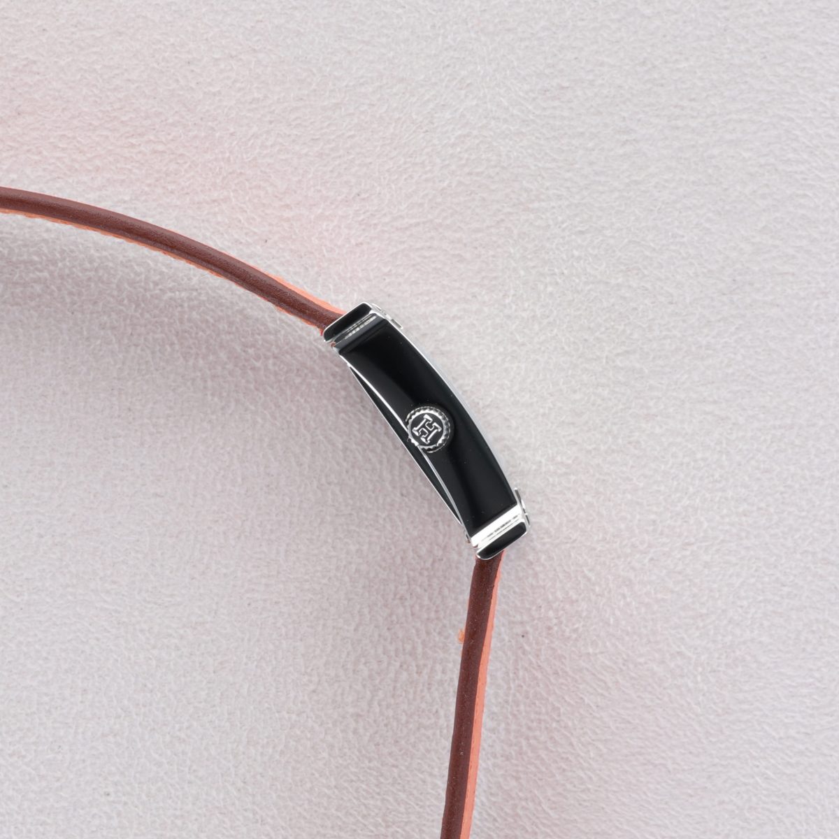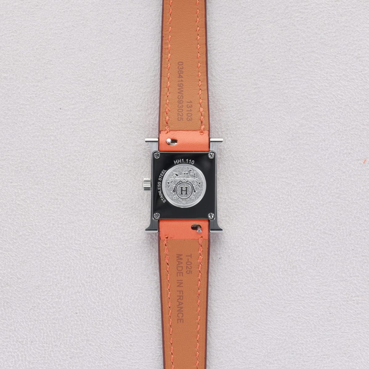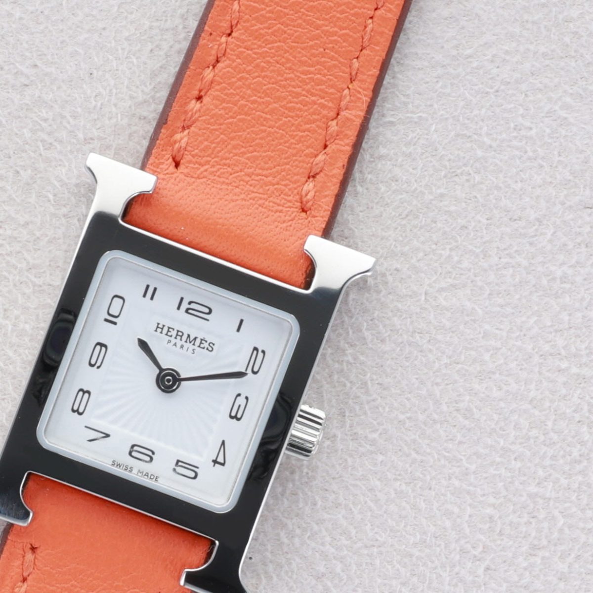 La montre Hermès Heure H Mini se distingue par son boîtier acier de 21 mm complété d’un cadran opalin argenté aux finitions sobres et raffinées. Le bracelet en cuir Swift couleur orange, long single-tour, apporte une touche de naturel et de confort, fermé par une boucle ardillon en acier poli. Son mouvement à quartz suisse assure une précision sans complications superflues, avec uniquement heures et minutes. Protégée par un verre saphir antireflet et résistante à une pression de 3 ATM, elle convient à un usage quotidien discret. Cette montre incarne l’élégance minimale chère à Hermès : un design graphique, une sobriété raffinée et un confort d’usage alliant style et simplicité.
