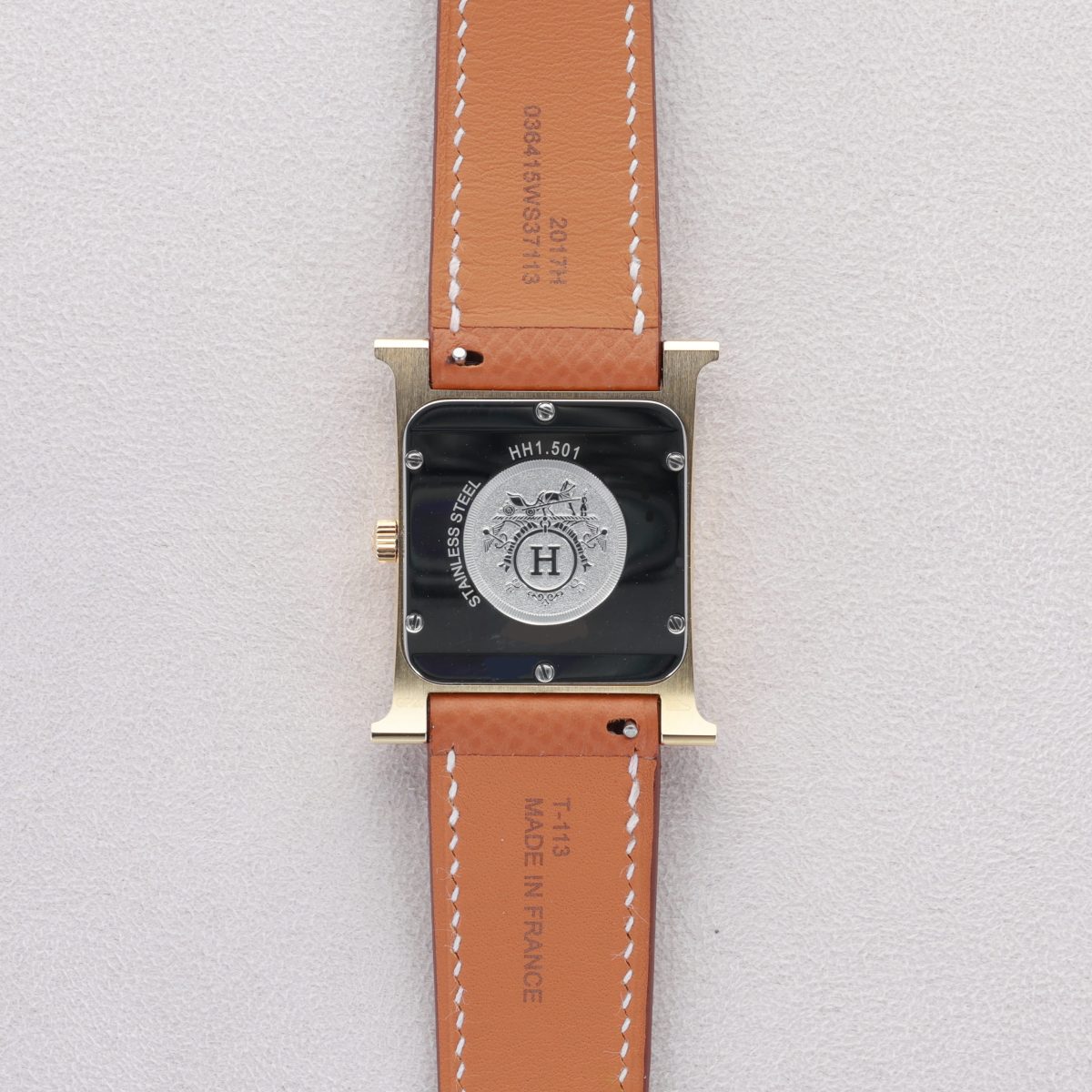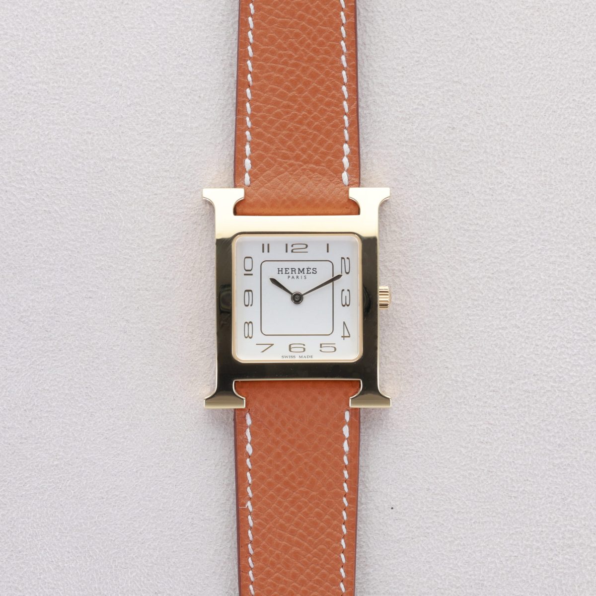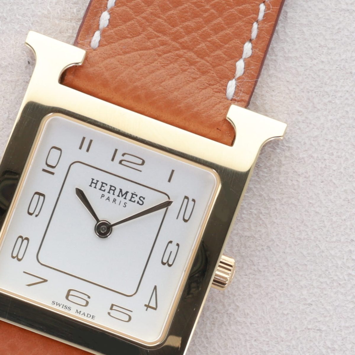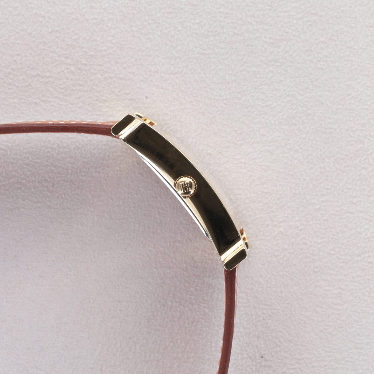 La montre Hermès Heure H Moyen, référence W404401WW00, présente un élégant boîtier en acier plaqué or jaune de 30 mm. Son cadran blanc est protégé par un verre saphir antireflet. Elle est animée par un mouvement à quartz suisse et offre une étanchéité jusqu’à 3 bar. Son bracelet interchangeable en cuir epsom gold chestnut, fermé par une boucle ardillon assortie, souligne son raffinement.