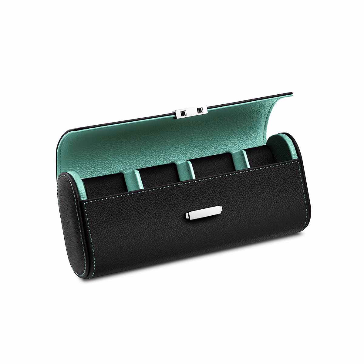 Étui de voyage en cuir équipé d’un coussin qui permet de ranger jusqu’à 4 montres et d’autres articles tels que des bracelets ou des colliers.
