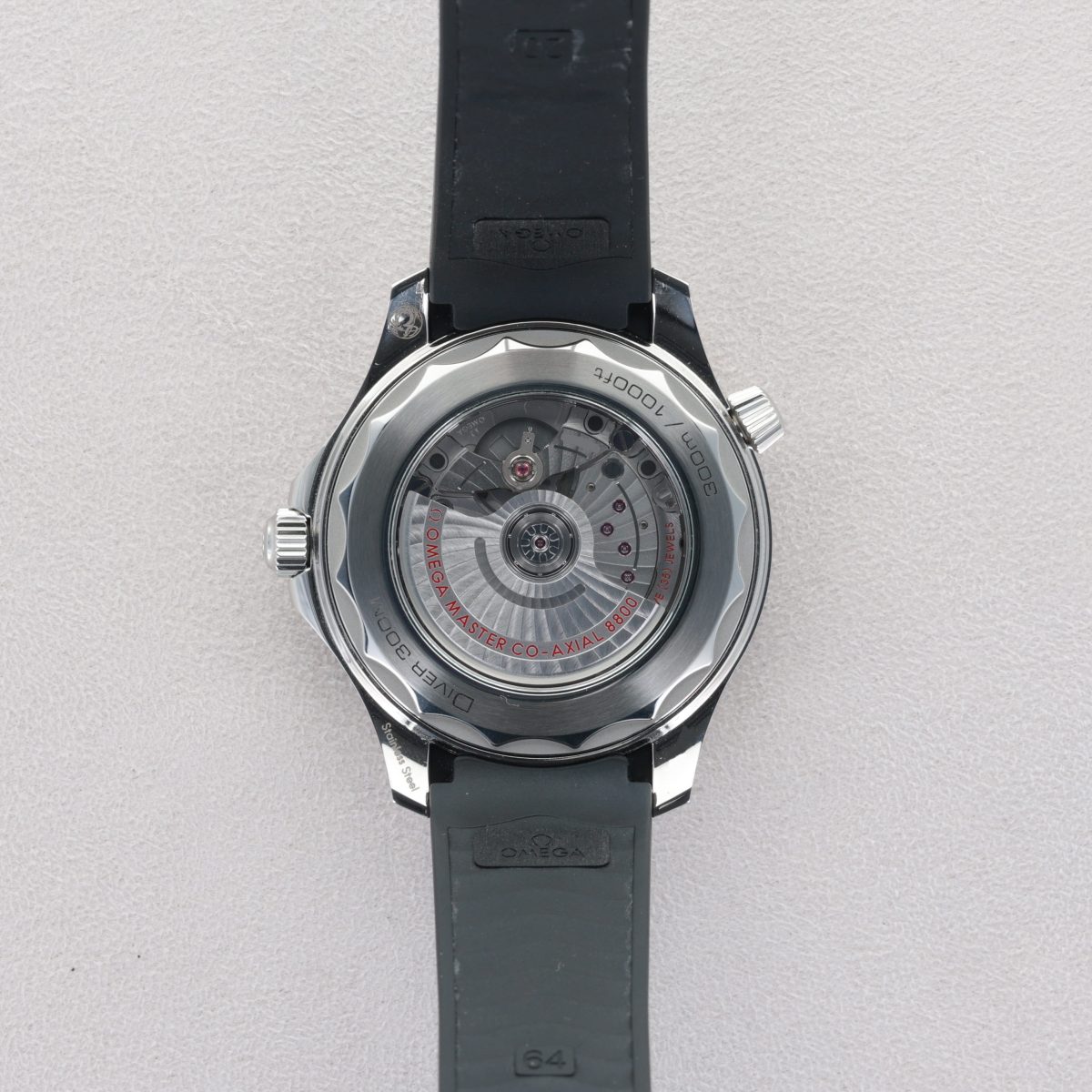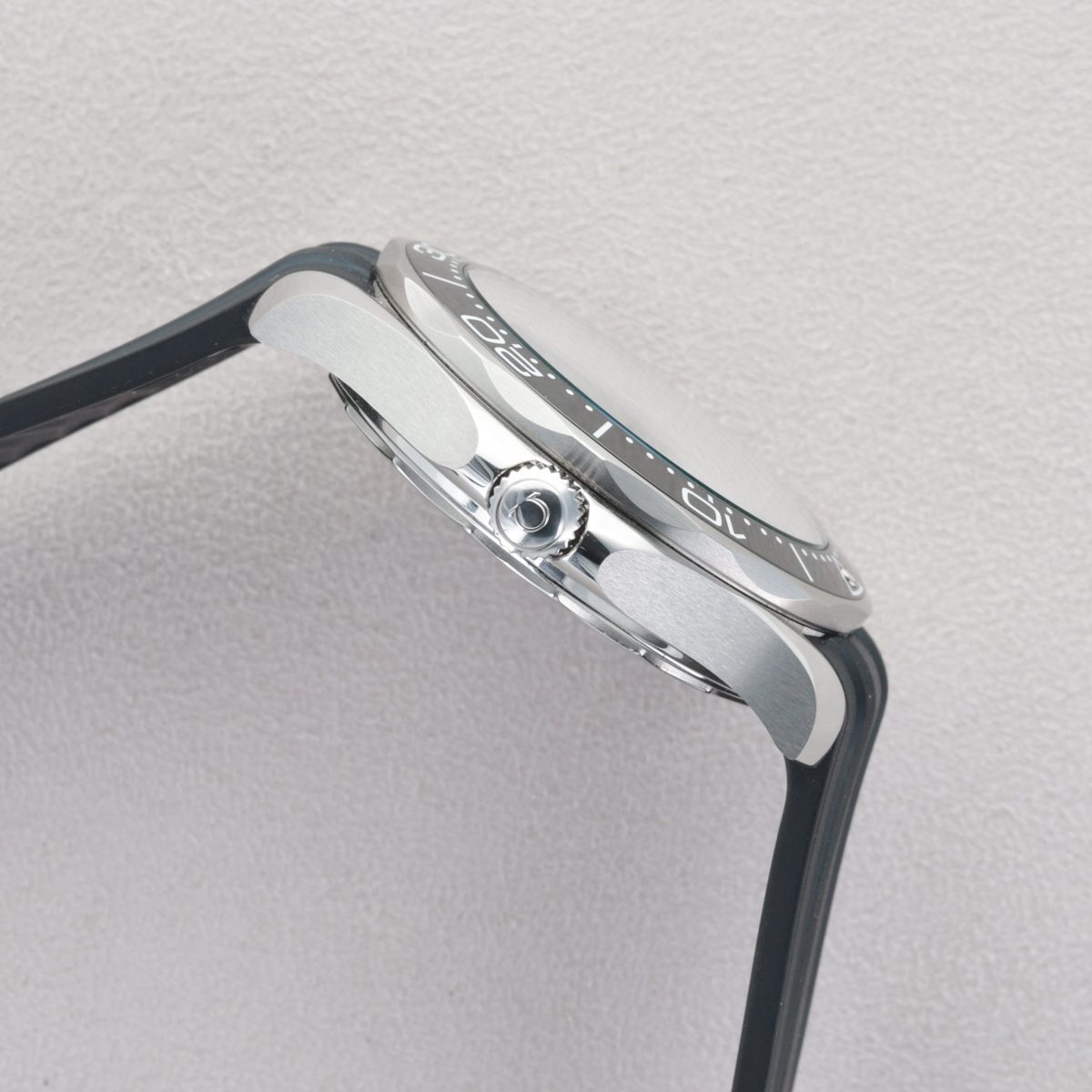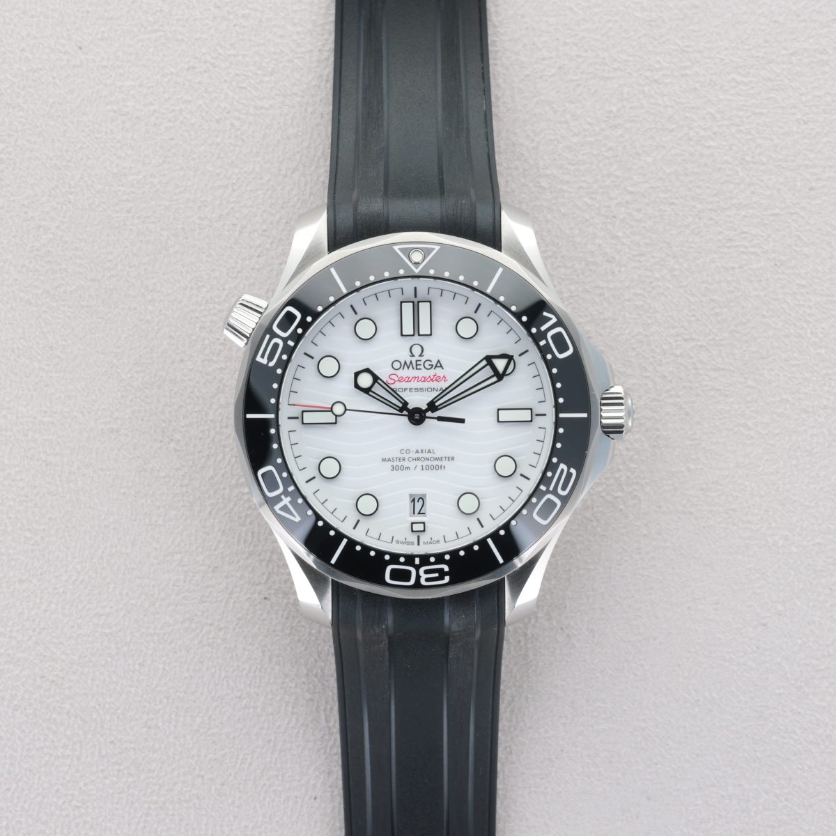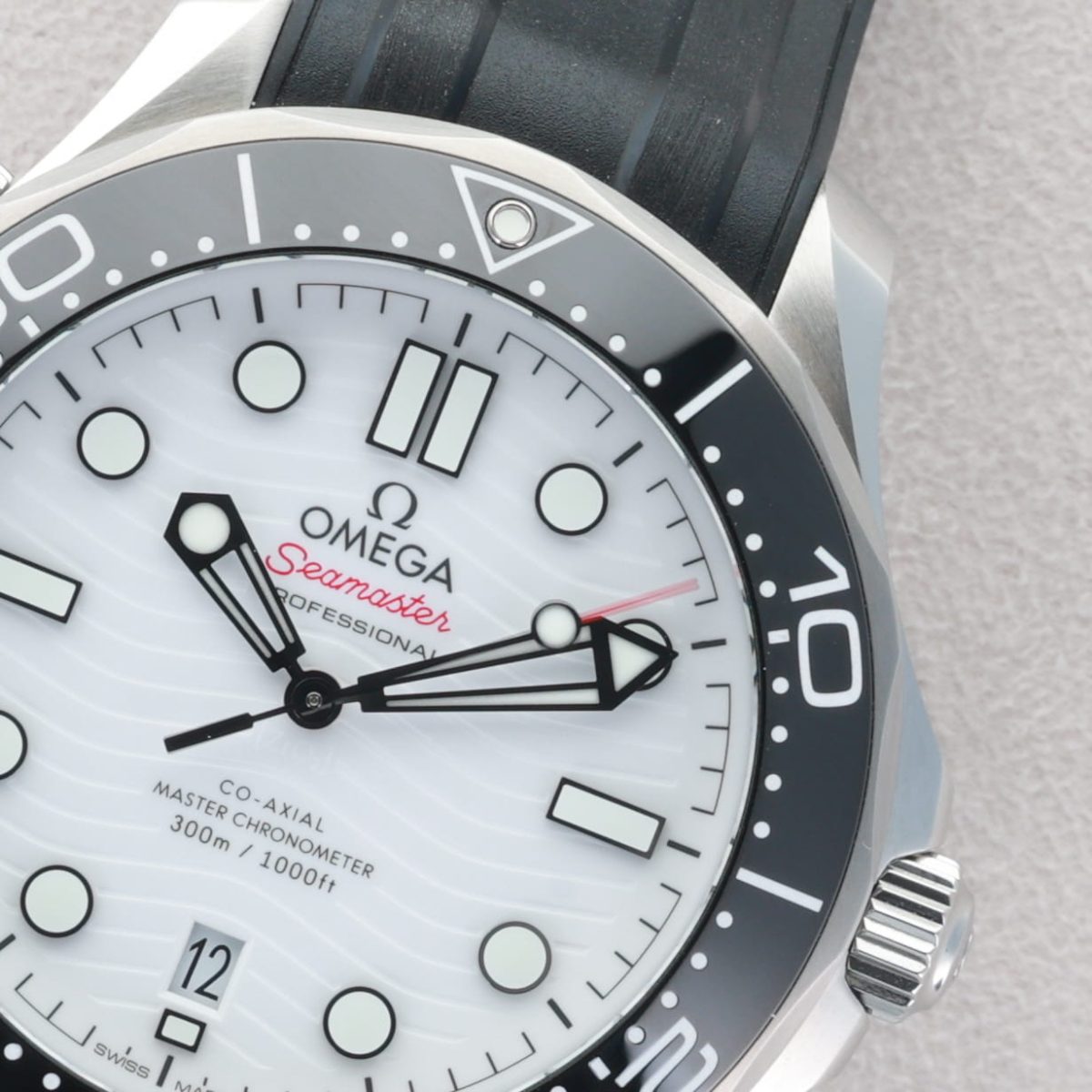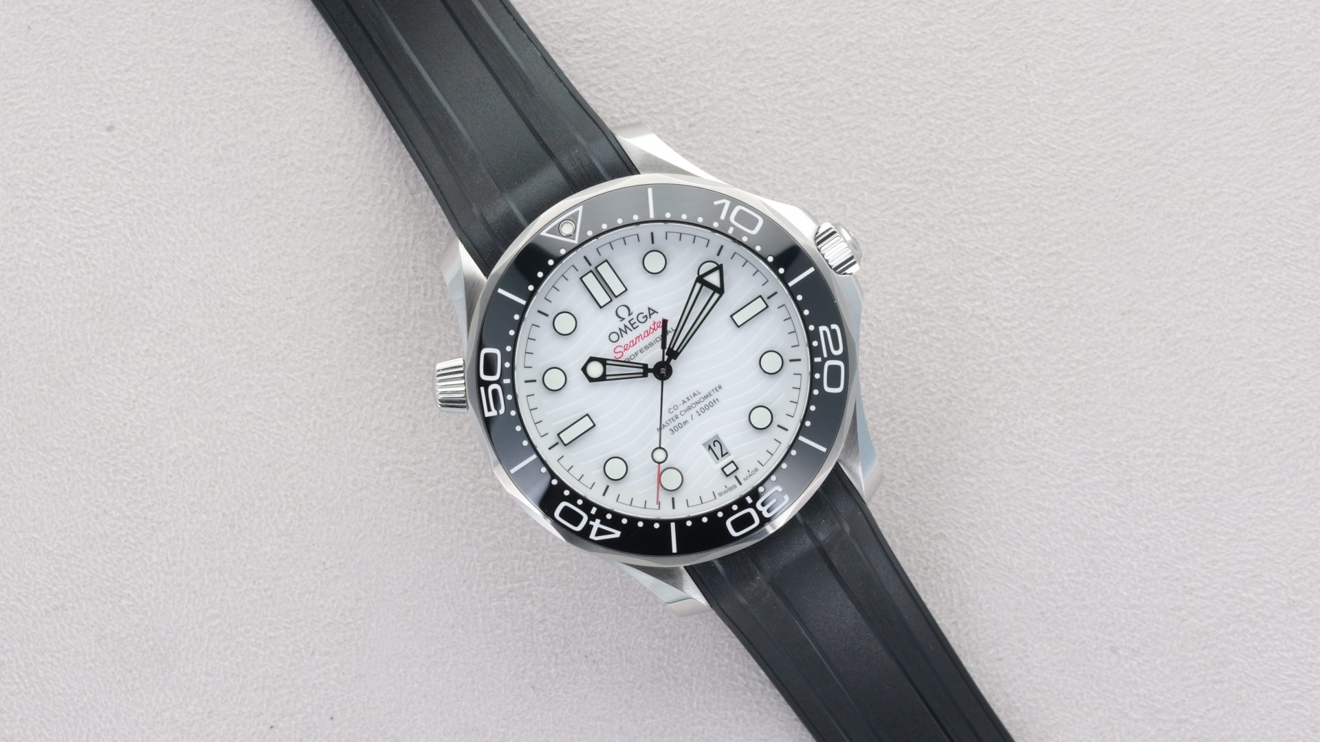 Icône depuis 1993, la Seamaster Professional Diver 300M incarne l’héritage maritime d’OMEGA allié à l’innovation et au design contemporain. Ce modèle de 42 mm en acier inoxydable présente une lunette en céramique noire et un cadran blanc poli orné de vagues gravées au laser. Les aiguilles noircies, squelettées et revêtues de Super-LumiNova offrent une lisibilité optimale, tandis que l’aiguille des secondes se distingue par sa pointe rouge. Montée sur un bracelet en caoutchouc noir intégré, la montre allie élégance et performance. Elle abrite le calibre OMEGA Master Chronometer 8800, visible à travers un fond saphir aux bords ondulés.