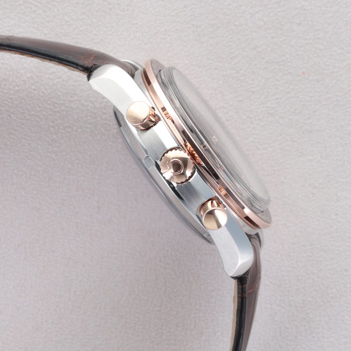 Le boîtier en or Sedna™ 18K et acier inoxydable est complété par une lunette en céramique brune avec une échelle tachymétrique en Ceragold™. La montre repose sur un bracelet en cuir brun avec boucle déployante.